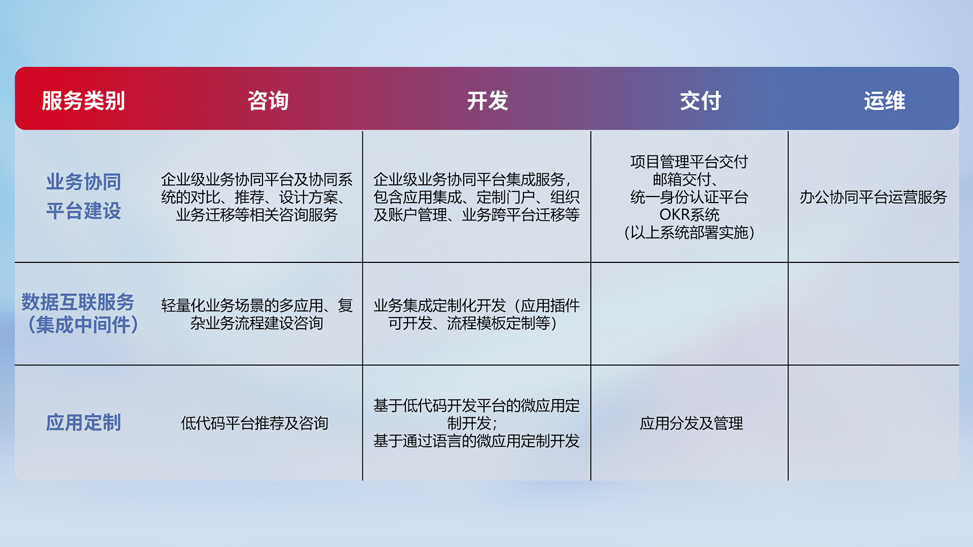 针对钉钉、、、企微、、、、IDaas等平台级产品提供产品的规划、、、方案、、、、交付、、、、定制化开发等服务,,实现如统一协同办公、、、智能客户服务、、、混合会议管理、、、智能数据查询、、、、等业务场景,,实现数字化转型。。